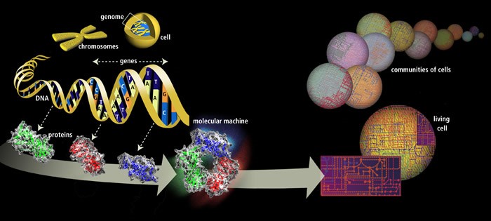 細胞核內的基因帶有製造蛋白質的機制, 所製出的蛋白質呈現細胞功能, 為生命現象的基礎.