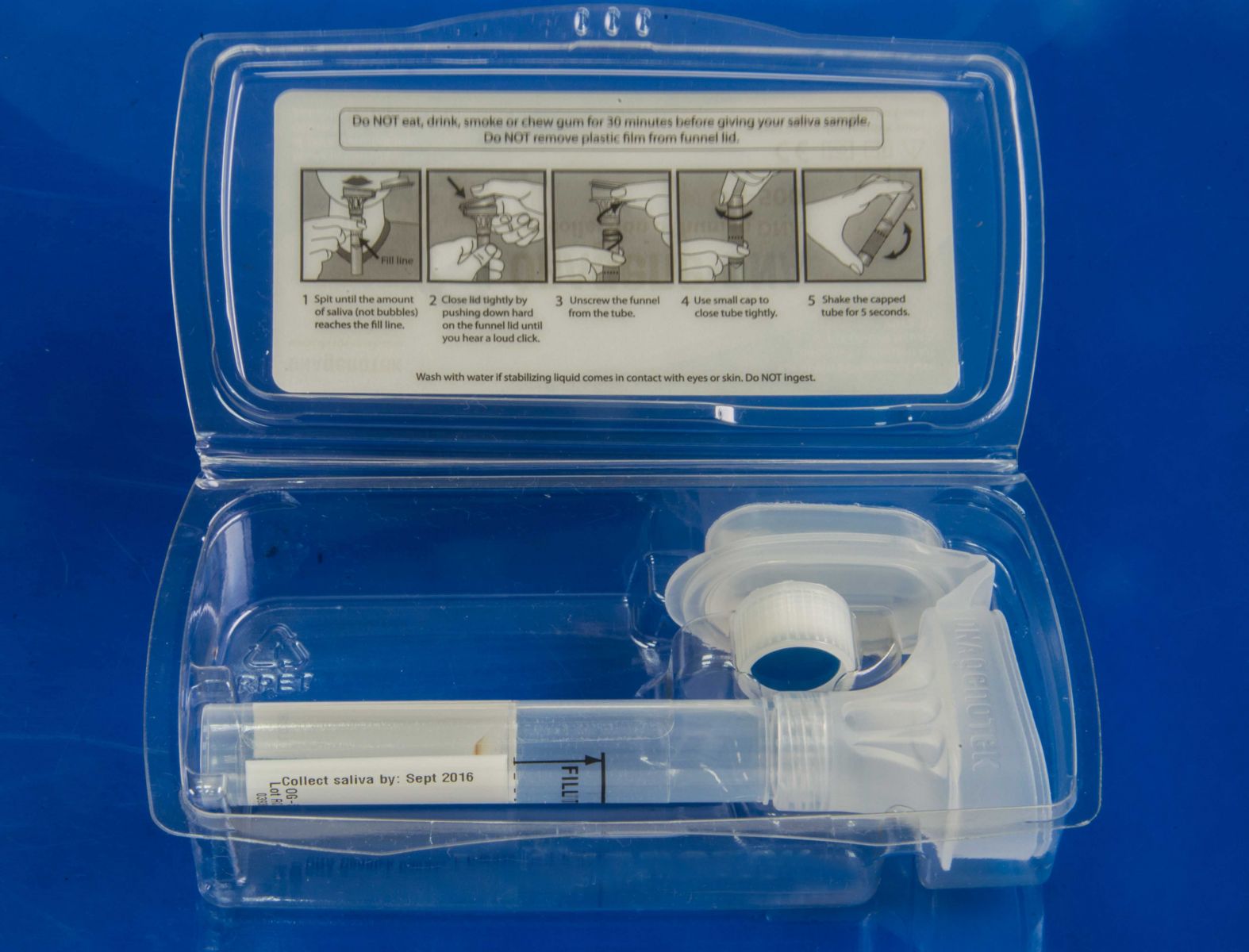 由唾液中取得剝落口腔黏膜細胞, 將唾液收集在特定的唾液收集器, 密封與固定液充分混合.